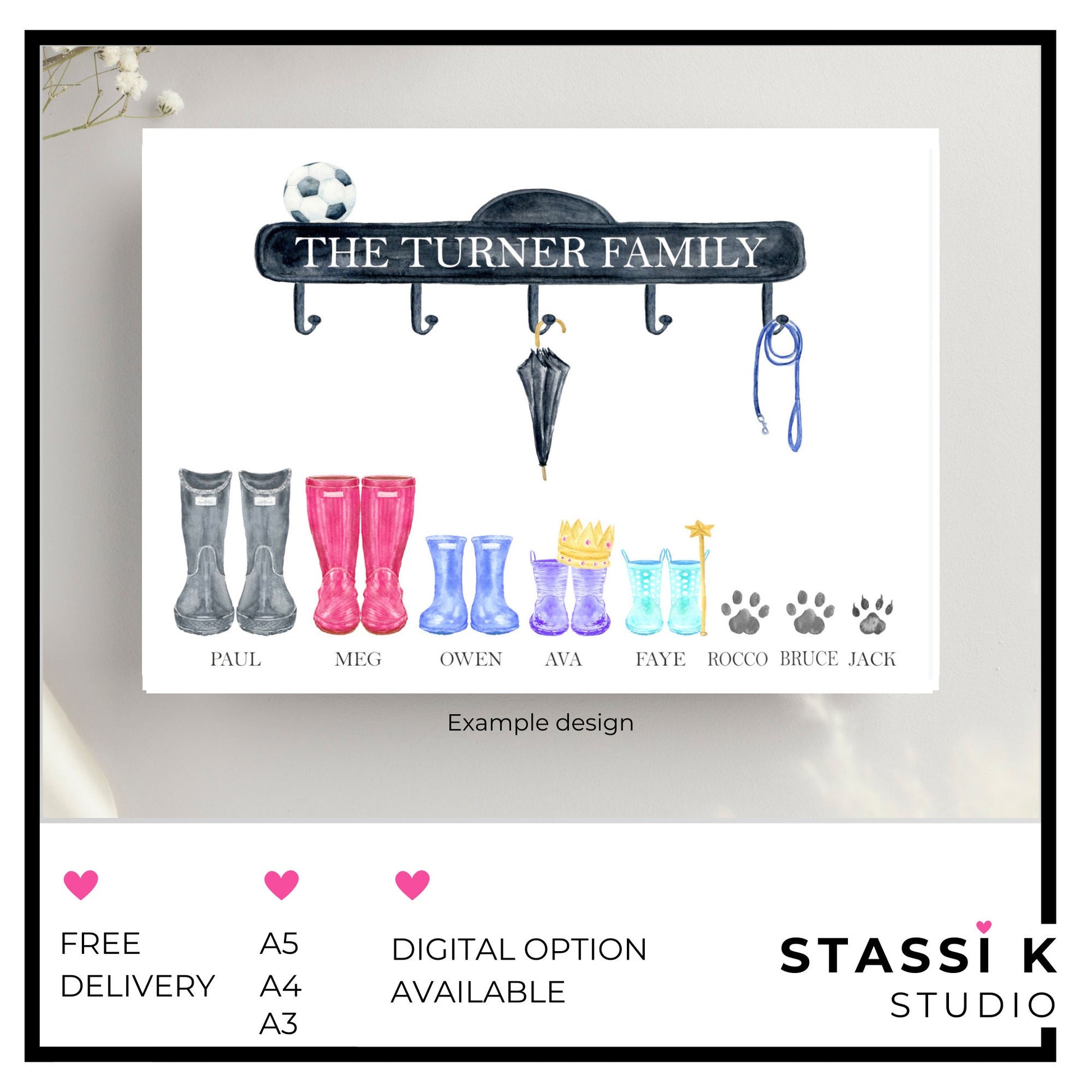 Family welly boot prints are individually created and can be customised with accessories reflecting the personality and hobbies of each family member making this a unique gift for any occasion or for yourself!