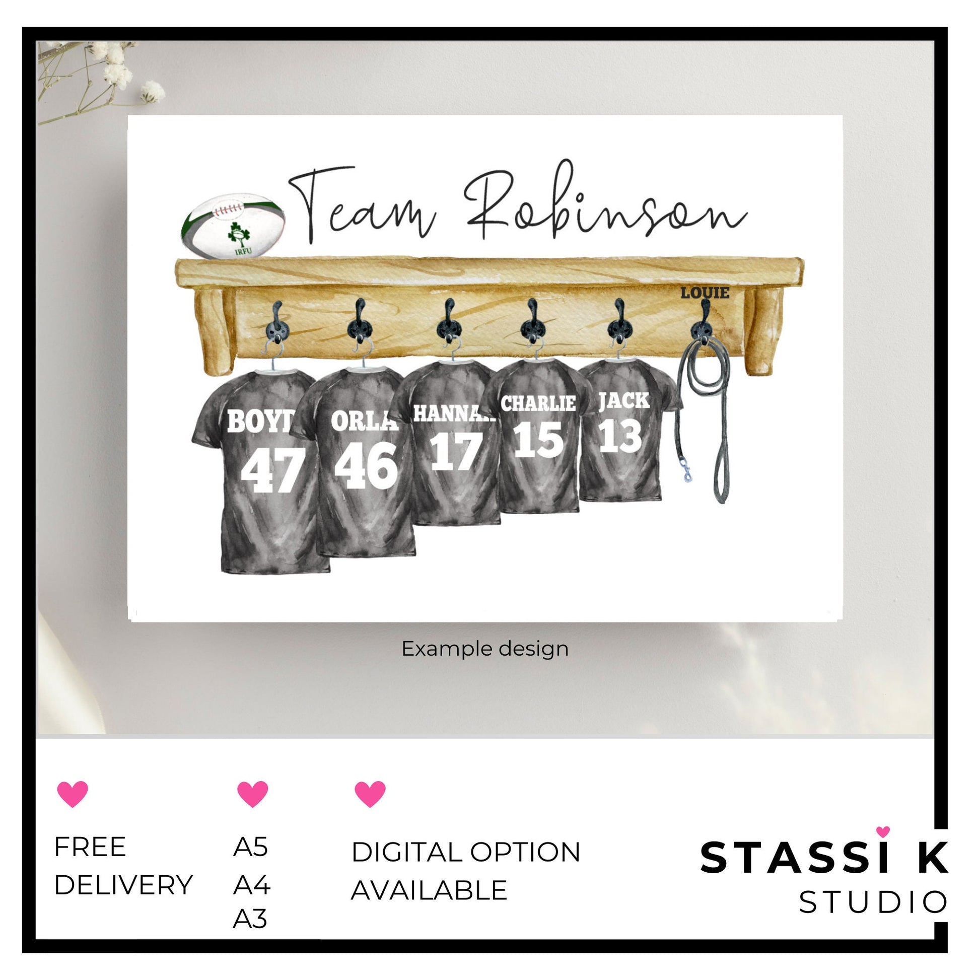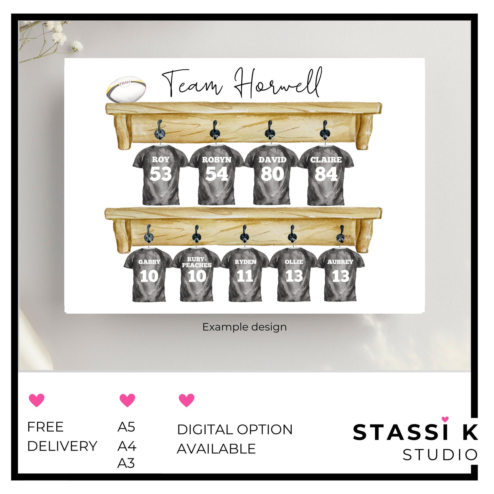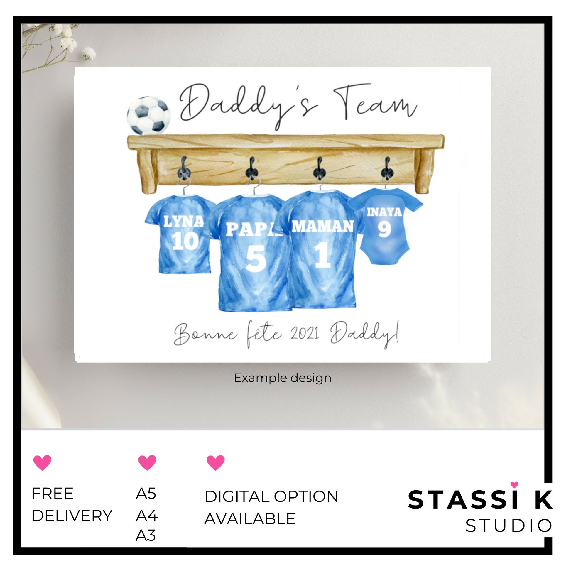 Some standard strip colours are included in the options for ease however I can create your design with any team strip. Don't all support the same team? No problem, just specify for each family member.